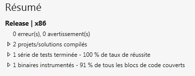 intégration continue permet de développer avec un réel suivi : chaque développement est contrôlé afin d'éviter au mieux les régressions et les performances du code source. Une fois relue, le code est archivé et automatiquement testé par les tests unitaires. Un minimum de 80% du code doit être couvert; rien de superflu. Le taux de réussite des tests unitaires doit être de 100%.